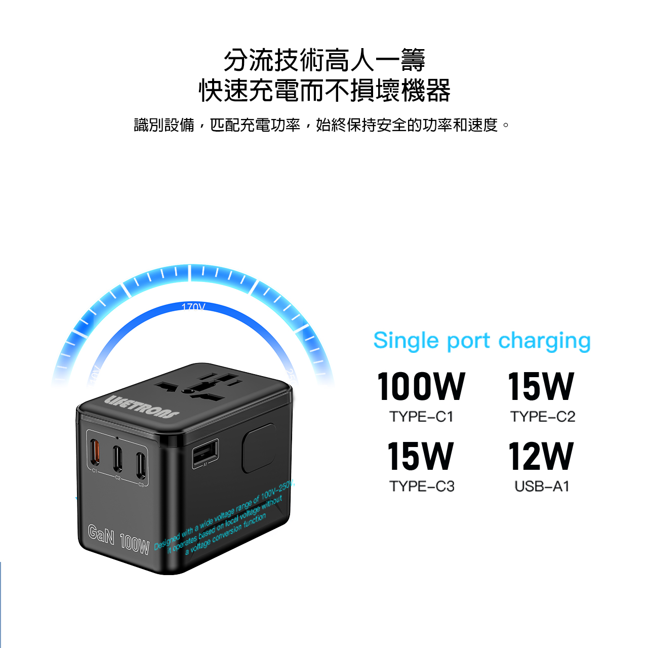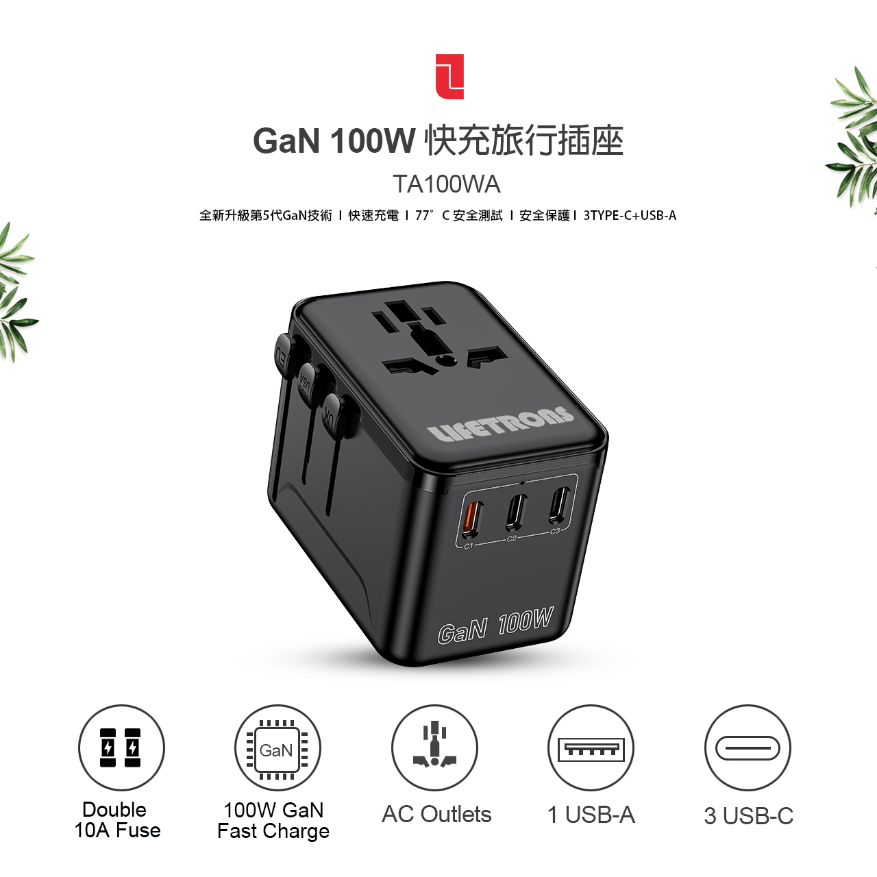 • 第五代GaN 100W超級快速充電,4 個端口(1 個 USB-A 和 3 個 USB-C 端口)