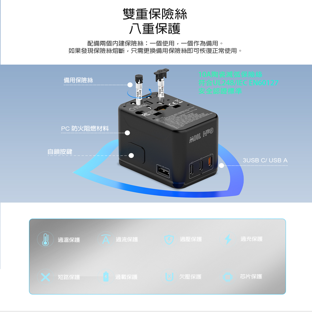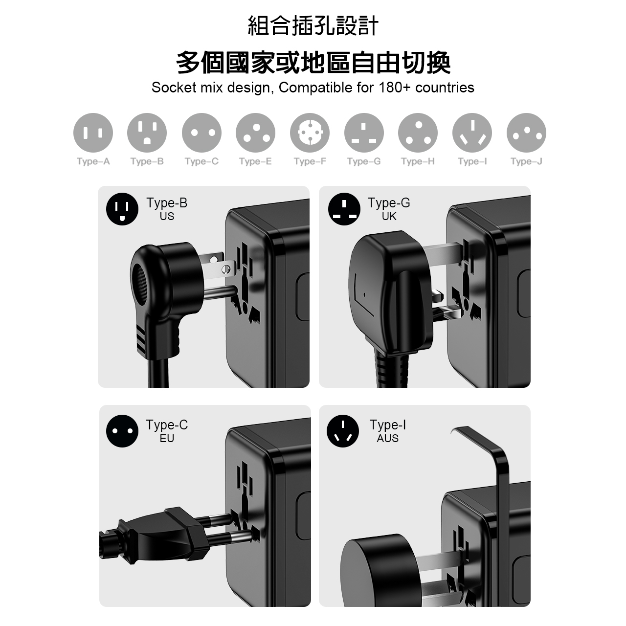 • 適用於180個以上國家,內置4種插頭:美國、澳洲、歐盟及英國(英國插腳按香港法例密封)。