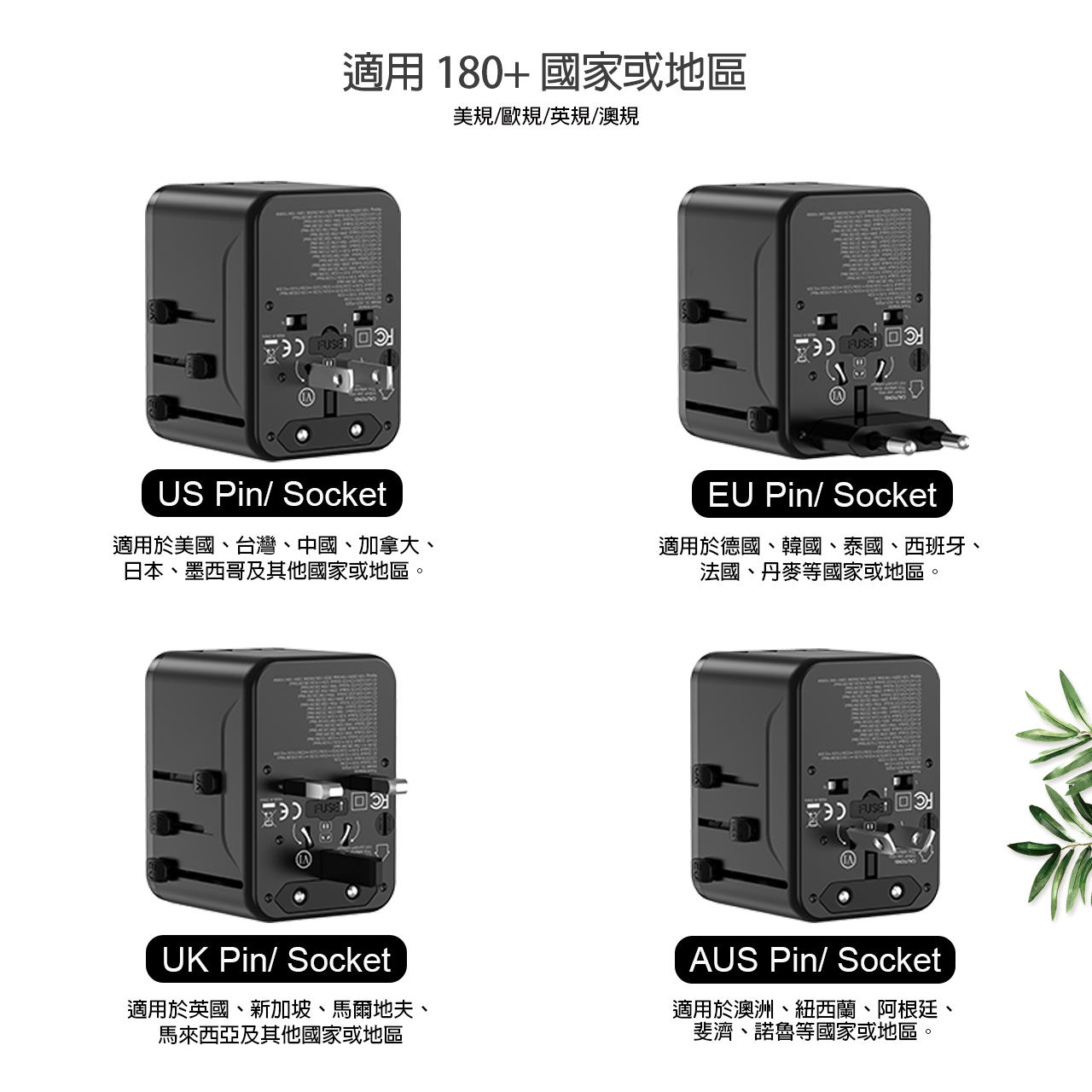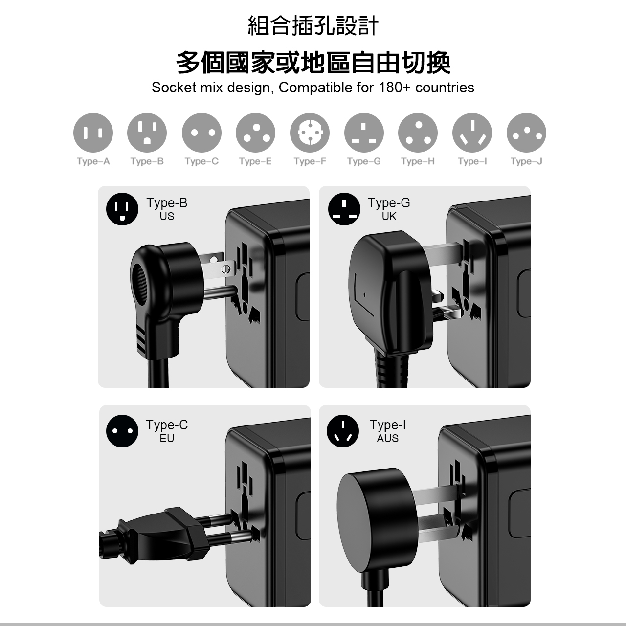 • 通用旅行轉插器/萬國插頭適用於180個以上國家,內置4種插頭:美國、澳洲、歐盟及英國(英國插腳按香港法例密封)。